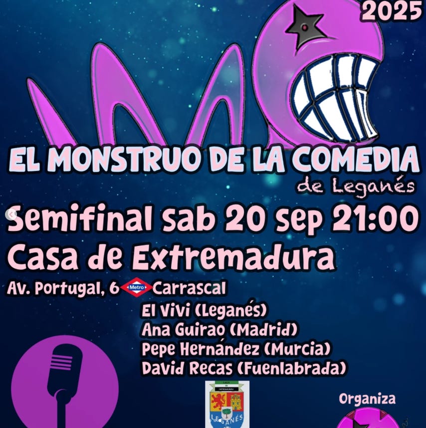 Si estás leyendo esto y el sábado 20 no tienes planes, ¡acércate a Leganés a apoyarme! Porque, a pesar de que ganar es muy difícil, si que voy a intentar que la gente se ría mucho viendo mi show.